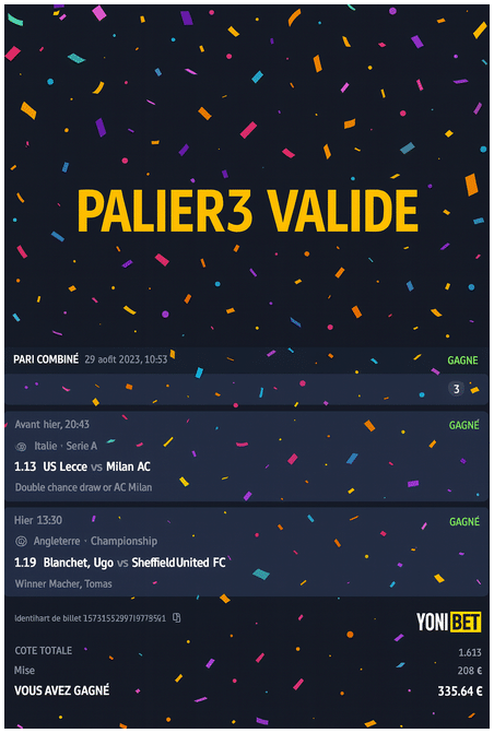 Voici nos 5 tickets validés pour cette montante validée pour la reprise des championnats dans  la partie VIP du site ( espace privé disponible en accès simple ou par abonnement ).